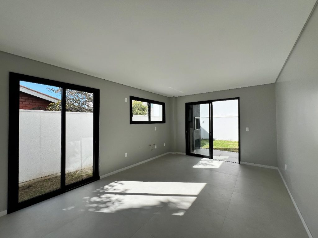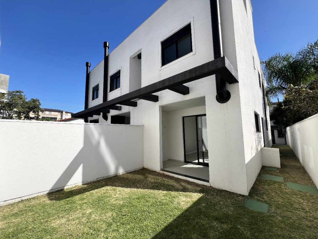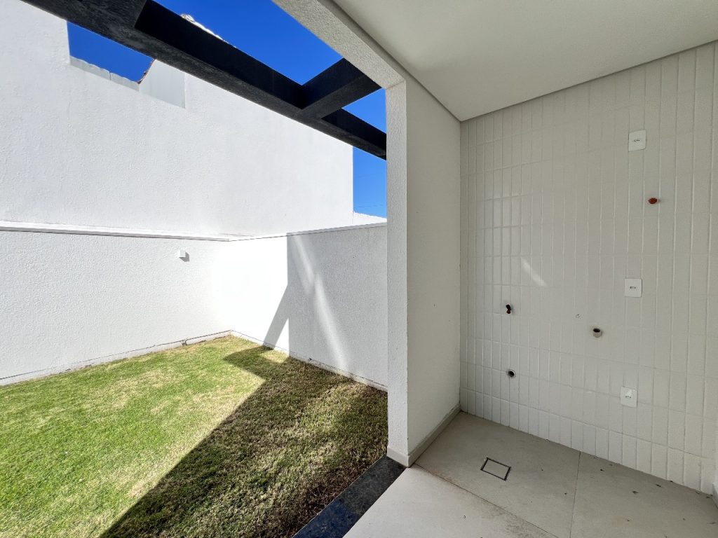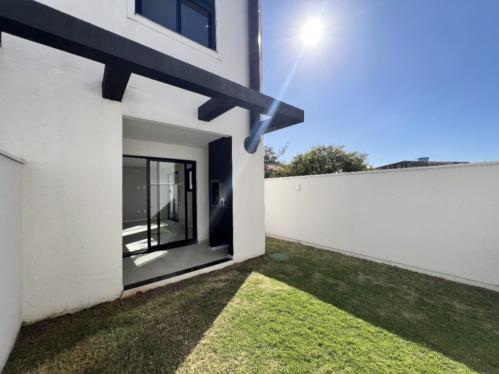 Andar térreo com sala de estar, cozinha com saída para área externa, lavabo, lavanderia, churrasqueira externa e pátio com jardim. Pavimento superior com três (3) quartos, sendo uma (1) suíte e duas (2) demi-suítes. Vaga de garagem para 2 carros com portão basculante.
