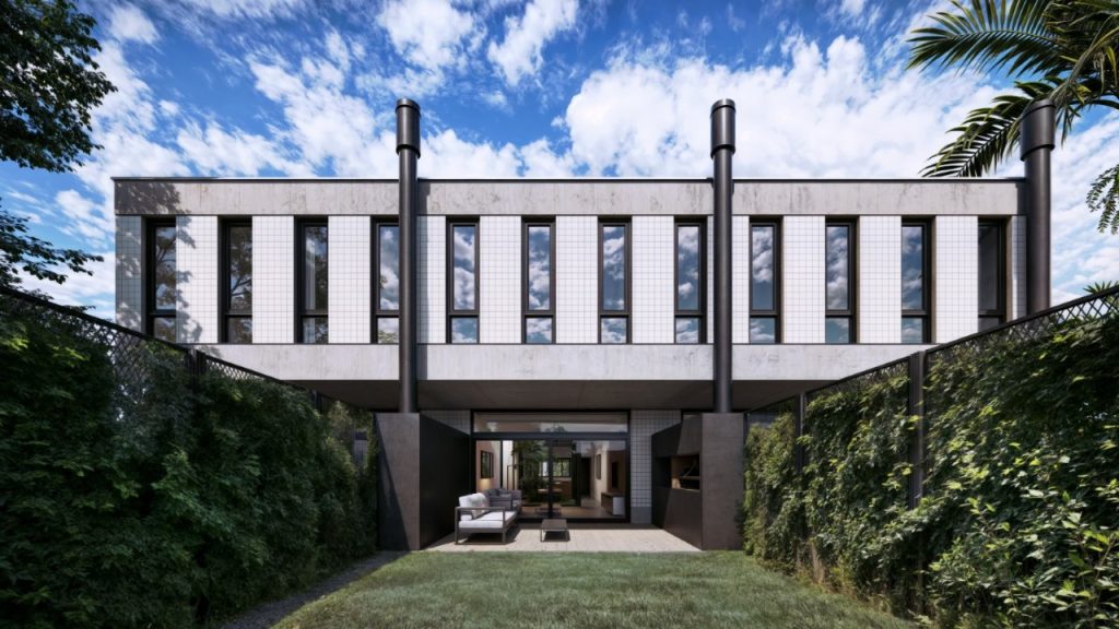 CASA 02: Com área privativa de 216m², sendo 183m² de área construída e 33m² de área descoberta (jardim), a casa é voltada para o sul na fachada, e norte nos fundos.
