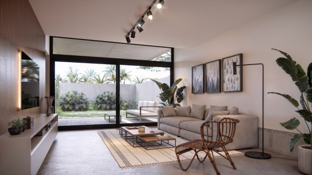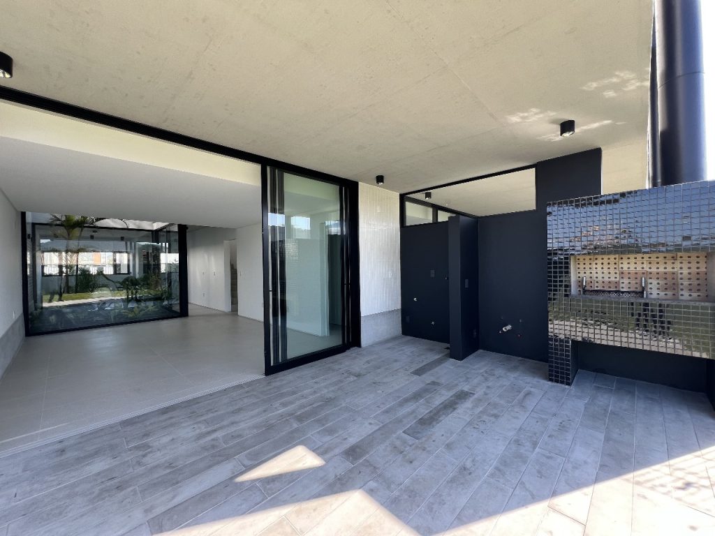 O térreo conta com ambientes integrados: cozinha e sala de jantar em conceito aberto, sala de estar com saída para área gourmet, lavabo, lavanderia e churrasqueira externa.